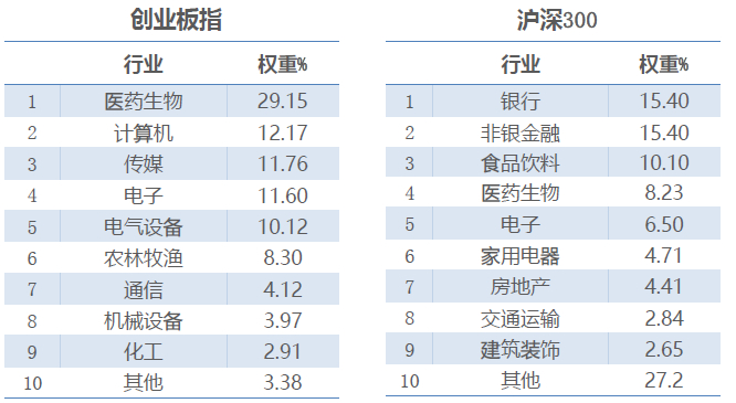 而创业板指前三权重行业为医药生物、计算机和电子,和沪深300指呈现出互补的特征。