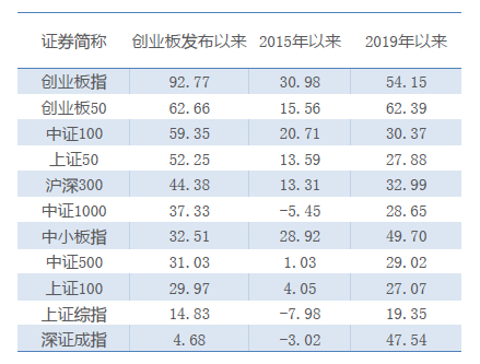 经历过涨跌循环之后,创业板指累计涨幅在所有宽基指数里相对领先。