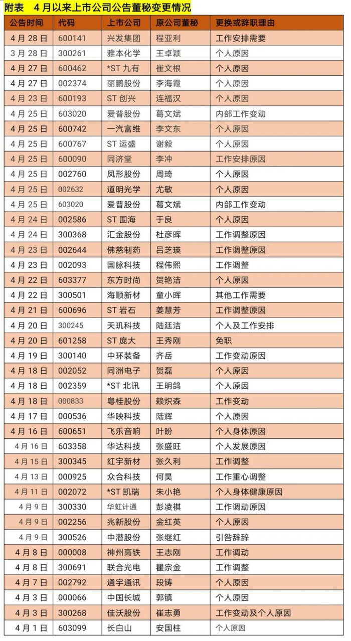《红周刊》记者发现,自2020年1月1日以来,A股市场中已有70余家公司发布了董秘辞职或更换公告,仅4月份就有40多位。就这些董秘辞职或更换的原因看,既有“工作调动原因”,如农业银行前董秘周万阜;也有“个人原因”,如雅本化学前董秘王卓颖。当然,离职原因中还包括了因公司受罚而“引咎辞职”的,如中潜股份前董秘张继红。