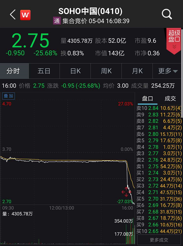 5月4日下午,港股上市公司SOHO中国尾盘也出现了快速跳水的行情,短短几分钟时间,股价跌幅就超过25%以上。