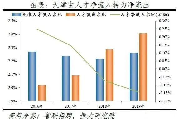 2016-2019年人才净流入占比分别为0.2%、0.1%、-0.1%、-0.1%,逐年下降且2018年由正转负,主因天津发展速度放缓、2019年GDP增速5.3%在十城中最低、且薪资在十城中最低。