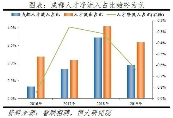 2016-2019年成都人才流入占比分别为2.3%、2.8%、3.7%、2.9%,流出占比分别为3.2%、3.1%、4.0%、3.6%,流出始终大于流入且差距在2017-2019年逐年增大,使得人口净流入占比分别为-0.8%、-0.3%、-0.3%、-0.6%。