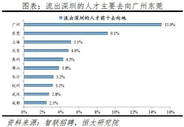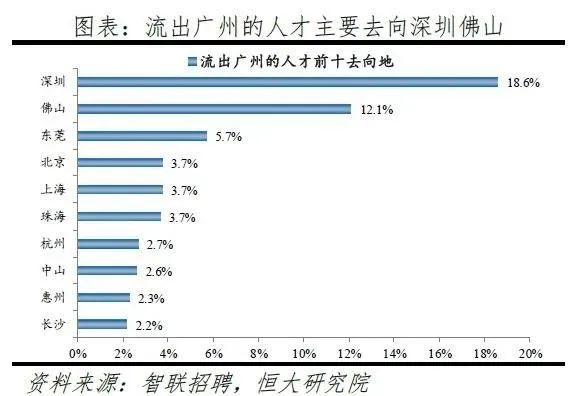 深圳和广州互为人才外流第一目标城市,深圳流向广州和广州流向深圳的人才流出占比分别为0.7%、0.6%,规模基本平衡;
