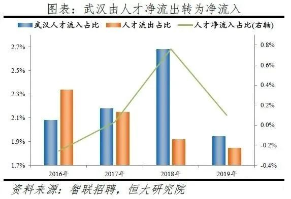 武汉2016-2019年人才净流入占比分别为-0.3%、0.0%、0.8%、0.1%,2017年由负转正,主因2017年“百万大学生留汉”政策实施;