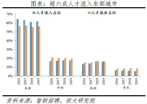 分地区看,2019年东部、中部、西部、东北人才净流入占比分别为5.8%、-2.4%、-0.2%、-3.2%,东部人才持续集聚,中西部持续流出但有所收窄,东北持续流出且幅度扩大。