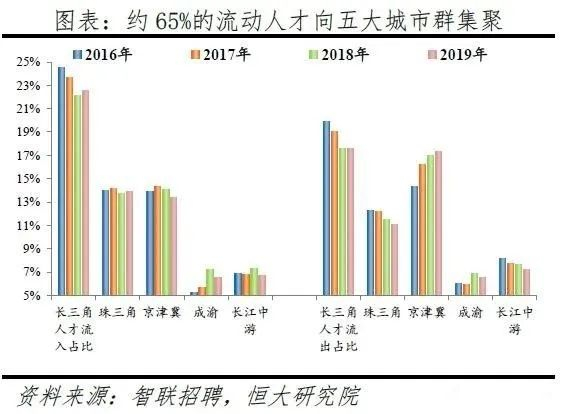 分城市群看,超6成人才流向五大城市群,2019年长三角、珠三角、京津冀、成渝、长江中游城市群人才流入占比分别为23%、14%、13%、7%、7%,净流入占比分别为5.0%、2.8%、-4.0%、0.0%、-0.5%,长三角、珠三角人才集聚,京津冀受北京控人影响人才净流出,成渝和长江中游基本平衡。