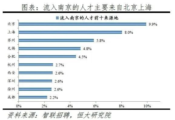 人才向南京流入的前十大城市分别是北京、上海、苏州、无锡、合肥、杭州、西安、深圳、徐州、成都,合计占比达45.7%。其中,有5个是长三角地区,合计占比达25.8%。