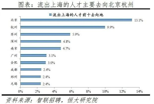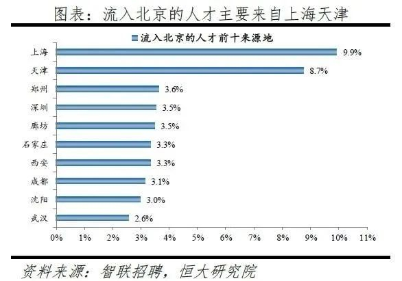 北京人才外流的前十大城市分别为上海、天津、深圳、成都、廊坊、济南、杭州、广州、石家庄、西安,合计占比达42.5%。