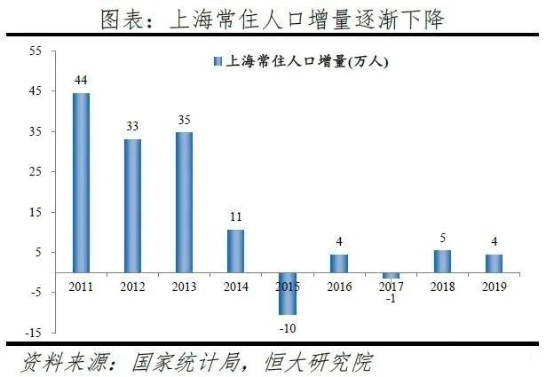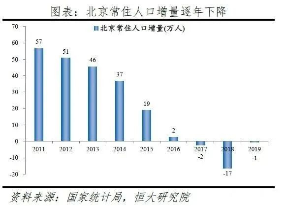 北京常住人口增量逐年下滑,2011-2018年从57万降至-17万,2019年缩窄至-1万,2017-2019年连续3年为负,2016-2019年北京的常住人口增量始终在一线城市中最低。