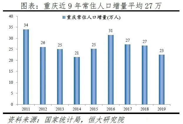 重庆常住人口增量维持在高位,2011-2019年增量平均为27万。