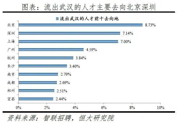 武汉人才外流的前十大城市分别为北京、深圳、上海、广州、杭州、长沙、南京、成都、郑州、宜昌,合计占比达45.1%。