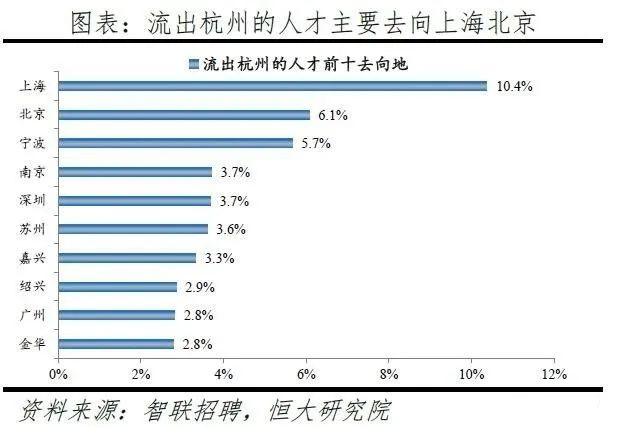 杭州人才外流的前十大城市分别为上海、北京、宁波、南京、深圳、苏州、嘉兴、绍兴、广州、金华,合计占比达44.9%。其中,有7个去向长三角地区,合计占比达32.3%。