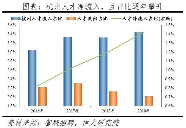 2016-2019年杭州人才流入占比分别为3.0%、3.3%、3.3%、3.4%,人才流出占比分别为2.2%、2.3%、2.1%、2.0%,人才流入明显大于流出,使得人才净流入占比分别为0.8%、1.0%、1.2%、1.4%,逐年攀升,2018-2019年居全国之首。