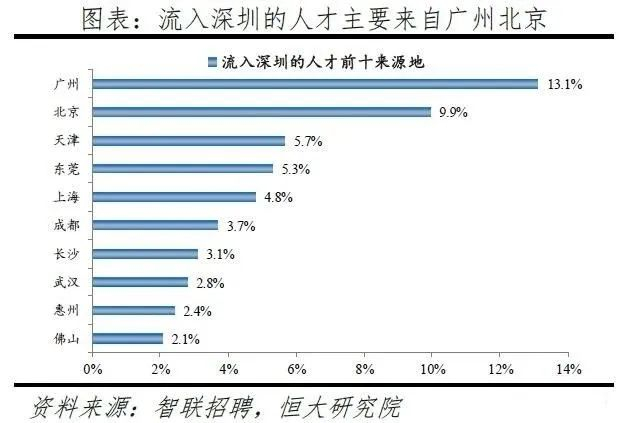 其中,珠三角城市有4个,占比22.9%;流入深圳的人才中13.1%来自广州,流入广州的人才中17.4%来自深圳,深圳和广州互为人才来源城市的第1位。