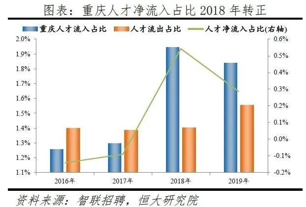 重庆2016-2019年人才净流入占比分别为-0.1%、-0.1%、0.5%、0.3%,2018年由负转正主因信息技术产业等发展吸引人才;