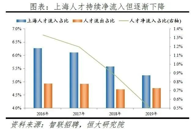 2016-2019年人才净流入占比分别为1.3%、1.2%、0.9%、0.5%,持续净流入但逐渐下降,主因上海控制人口及产业转移。