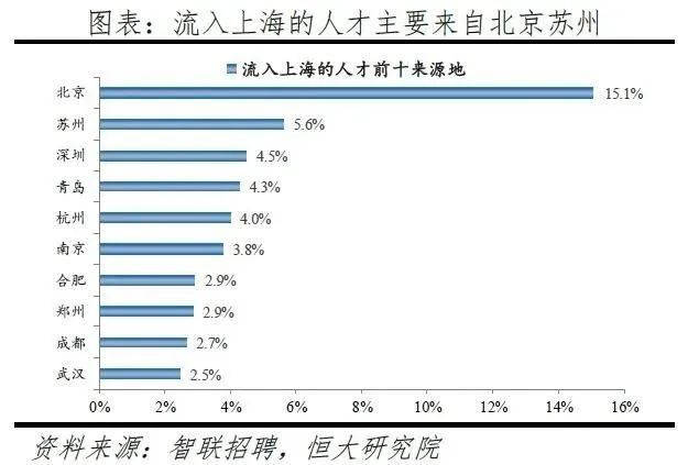 其中,北京占比15.1%,而长三角城市有4个、合计占比16.3%。人才流入上海主要因为上海的经济体量大、薪酬水平高。2019年上海GDP规模达到3.8万亿、位列全国城市第一。
