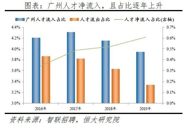 2016-2019年人才净流入占比分别为0.3%、0.5%、0.5%、0.6%,人才净流入且持续稳定增长,主因广州发展速度较快、生活成本在一线城市中最低。
