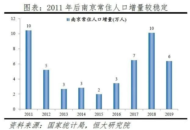 和上述其他城市相比,南京常住人口增量相对稳定,2011-2019年始终在2-10万区间波动、2019年为6万。