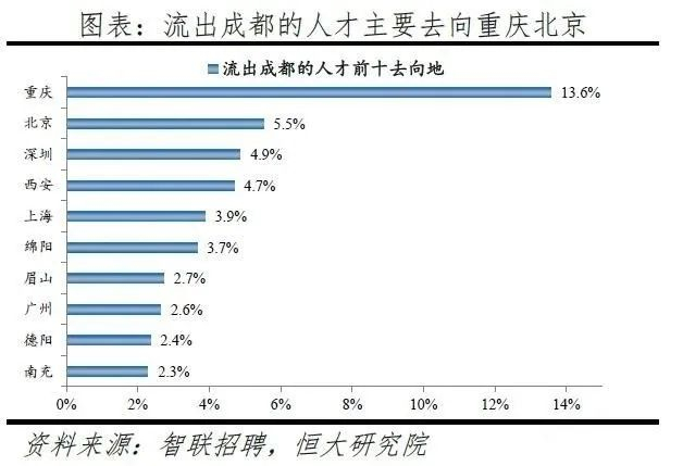成都人才外流的前十大城市分别重庆、北京、深圳、西安、上海、绵阳、眉山、广州、德阳、南充,合计占比达46.2%。