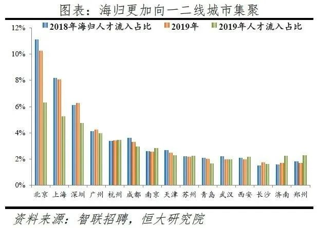海归人才流入占比前四名分别是北上深广,合计占比28.7%,高于北上广深人才流入占比的20.2%;海归人才流入前十城市还有杭州、成都、南京、天津、苏州、青岛,前十合计占比44.6%,高于前十城市的人才流入占比35.5%,意味着和流动人才相比,海归人才也更加向一二线城市集聚,尤其是向一线城市集聚。