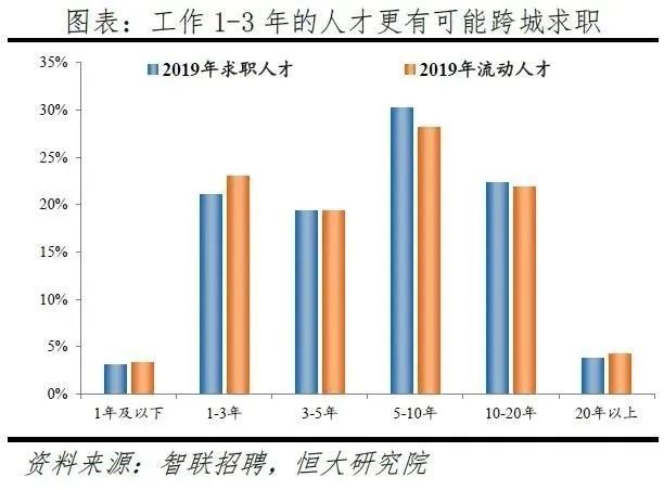 从工作年限看,流动人才中46%工作5年及以下,高于求职总体的44%,职场新人更有可能跨城求职;