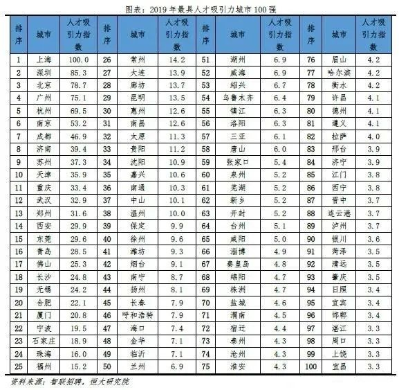1. 中国最具人才吸引力城市100强:沪深京居前三