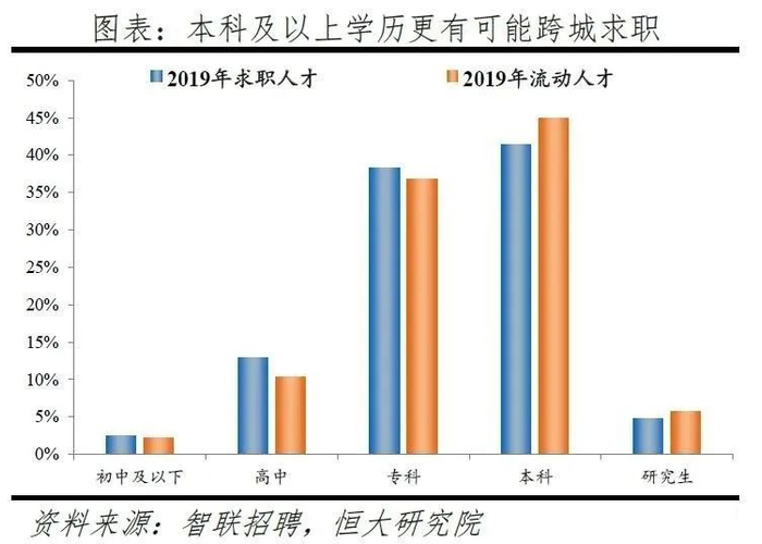 从学历看,流动人才中52%为本科及以上,明显高于求职总体的37%,高学历更有可能跨城求职;