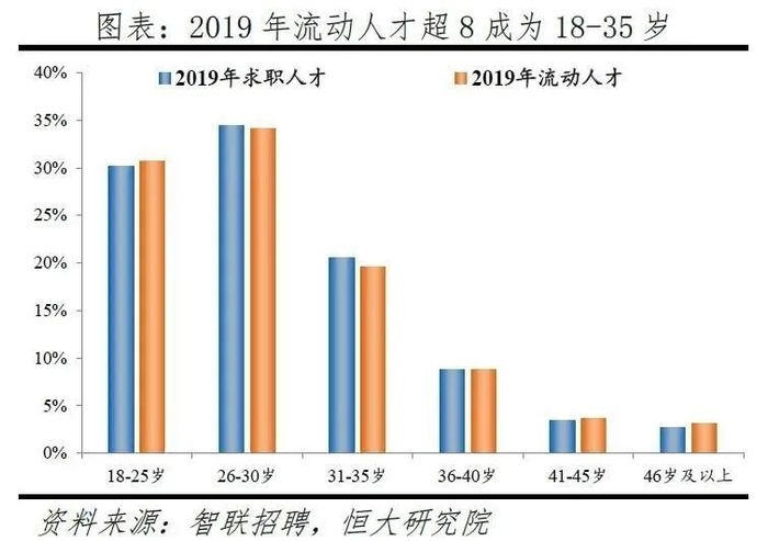 2019年求职人才中18-25岁、26-30岁、31-35岁、36-40岁、41-45岁、46岁及以上分别占比30.2%、34.5%、20.5%、8.8%、3.4%、2.6%;流动人才中各年龄段人才分别占比30.7%、34.1%、19.6%、8.8%、3.7%、3.1%。