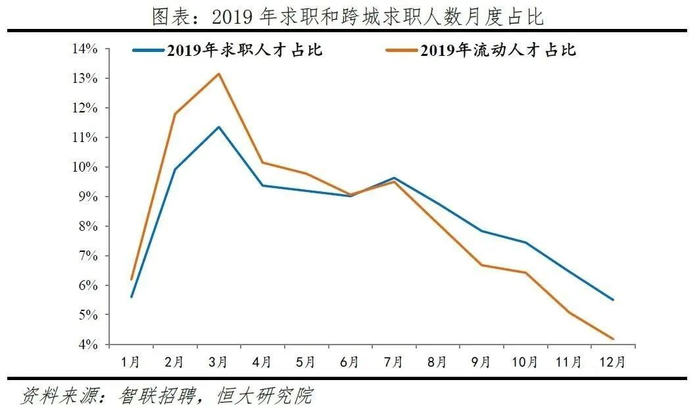 人才求职和跨城求职具有明显的月度波动性,求职高峰一般在春节后的3月,2019年3月求职人数和流动人数占比分别为11.3%、13.1%,2018年分别为12.1%、12.3%。