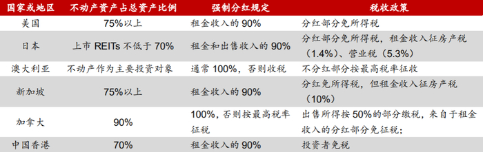 REITs有强制分红的要求,且分配的红利可以在税前抵扣,从而避免双重征税,如美国要求每年至少以股息形式分配其普通应纳税所得额的90%,否者征税。
