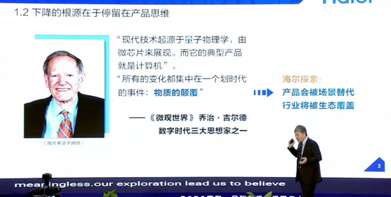为什么要转为物联网新思维?张瑞敏表示,网络时代生产率反而下降,第二次工业革命大量发明彻底改变了人民的日常生活,第三次工业革命,增长趋缓的基本答案在于两次工业革命存在的本质,增速下降的根源在于停留在产品思维。产品会被场景替代行业将被生态覆盖,一定要转换思维,一定要有互联网新思维,否则没有出路。