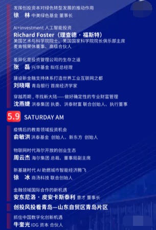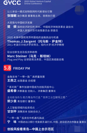 中国证券投资基金业协会会长洪磊,海尔集团董事局主席兼首席执行官张瑞敏,国民经济研究所所长、中国经济体制改革会副会长樊纲,2011年诺贝尔经济学奖得主托马斯·萨金特,美国国家科学院院长俱乐部主席、麦肯锡荣休董事兼高级合伙人理查德·福斯特,美国硅谷著名创业家、天使投资人史蒂夫·霍夫曼,中国联通党组书记兼董事长王晓初,山东重工集团有限公司董事长谭旭光,洪泰基金创始人、新东方创始人俞敏洪,洪泰基金创始人、洪泰集团董事长盛希泰,丝路基金总经理王燕之,中国进出口银行副行长、中国—欧亚经济合作基金董事长宁咏,中美绿色基金董事长徐林,同创伟业董事长、创始合伙人郑伟鹤,洪泰集团执委、洪泰财富联合创始人兼执行董事沈燕婕,商汤科技联合创始人徐冰,渶策资本创始合伙人甘剑平,IDG资本合伙人牛奎光,火山石资本创始合伙人章苏阳,36氪总裁冯大刚等重量级嘉宾。这必将是继去年大会后,青岛创投领域又一次规模空前的顶级盛会。