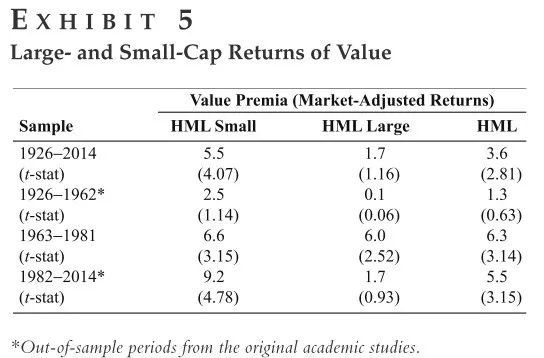 图5的“小HML”,这是对小盘股进行买多廉价和卖空昂贵股票的操作,“大HML”是对大盘股进行同样的操作。“常规HML”,是小HML和大HML投资组合收益的均值。这些投资组合的平均市场调整收益率报告包括四个样本周期。