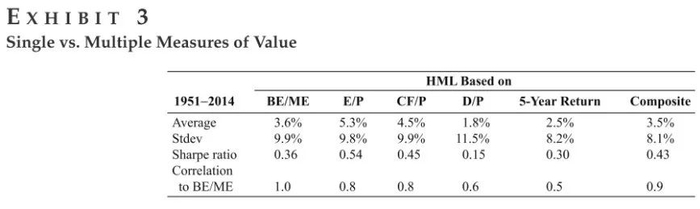 图3统计了使用不同的价值策略对股票排名的HML风格投资组合。这些投资组合来自于Kenneth French的网站,涉及到前30%的价值股,再剔除后30%的成长股,基于账面市值比(BE/ME)、每股收益(E/P)、每股现金流(CF/P)、股息收益率(D/P)和过去5年的负增长收益率。虽然使用不同的策略会有不同的收益,但所有HML风格的投资组合都有正收益,并高度相关。此项统计表明,多个价值度量产生更稳定的价值组合,提供更高的夏普比率、更高的信息比率和更稳健的收益。除非理论决定将一个度量优先于所有其他度量,平均的方案通常是最好的和最稳健的方法。