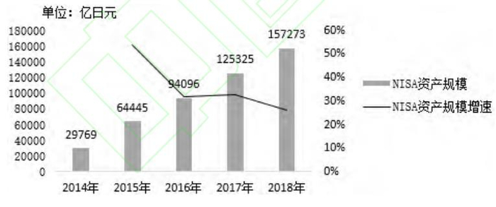 NISA是具有税收优惠的个人储蓄账户,是为了鼓励年轻人为养老而做投资和储蓄而设置的。规模尚小,发展速度很快。自2014年建立以来,NISA申请账户人数年均增长36%,2018年NISA的资产规模为1.57万亿日元,增速逐年下降,2018年在25%以上,2019年6月,NISA规模为1.76万亿日元,占2018日本GDP的0.33%。