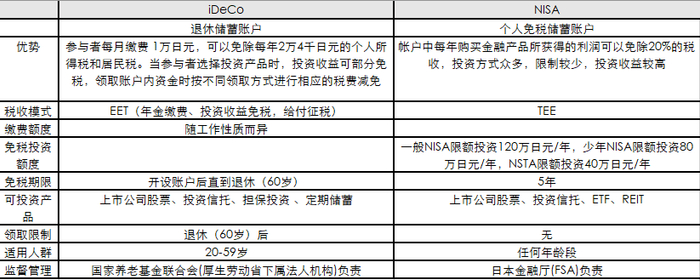 根据日本金融厅2019年的报告,按日本60岁以上的人口中将有25%可以活到95岁推算,除国家基本养老金外,每位日本国民需要自行准备2千万日元(约合128万人民币)来满足老年生活的基本开销。因此政府建议民众在工作时就开始着手做金融投资,NISA便是为鼓励日本年轻人为养老生活做提早准备而开设的免税个人投资账户。日本当前资本利得税为20.315%,因此免税账户非常具有吸引力。2014 年开始的一般个人储蓄计划规定20岁以上的日本居民可以向金融机构申请开设一个账户,在该账户中的股票、ETF以及房地产信托投资基金(REIT)等的收益前5年均可免税,每年投资限额120万日元。2016年开始的少年储蓄计划针对 0-19年的少年人,每年投资限额80万日元。2018年开始的小额累积投资免税计划支持长期投资,免税期20年,每年投资限额80万日元。