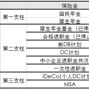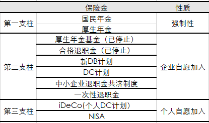 日本的养老体系也是“三大支柱”体系,第一支柱是国民年金和厚生年金,第二支柱为企业自愿加入的保险计划,第三支柱为个人自愿加入的保险计划。日本的养老保险统称为年金,日本养老制度起源很早,可追溯到明治时期的“恩给制度”,自20世纪70年代正式步入老龄化社会以来,养老制度经历了一系列的改革,如今形成了如表1所示的三支柱体系。
