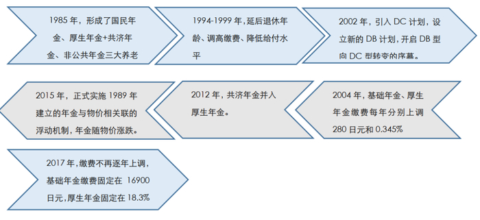 1994年日本老龄化程度已达14%,1990-2000年,房产泡沫破裂,日本经济形势严峻,养老金制度以延后退休、调高缴费和降低给付为改革方向。旧的DB计划以厚生年金基金为代表,该计划规定企业需要达到5.5%的收益,在经济衰退期出现了资金无法收回、基金崩盘的现象,于是2002年日本政府参考欧美的企业年金制度,设立了新的DB计划,并引入DC计划,开启了待遇确定型计划向缴费确定型计划转变的序幕。