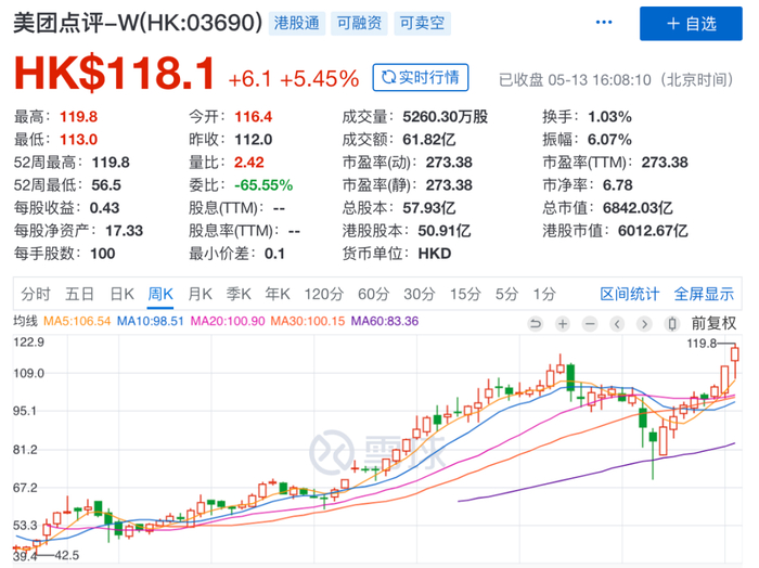 值得一提的是,美团点评(3690.HK)今日股价盘中创下119.8港元/股的新高,截至盘后,报118.1港元/股,总市值达6842.02亿港元,约6267亿元人民币。