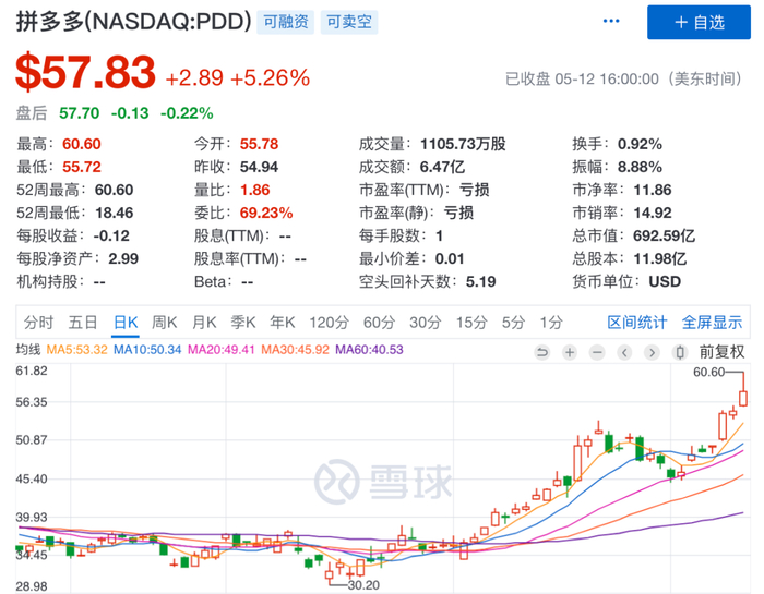 美东时间5月12日,在美股上市的拼多多(PDD)再度大涨,盘中最高冲至60.6美元/股,总市值一度突破700亿美元大关。截至收盘,该股大涨5.26%,报57.83美元/股,市值达692.59亿美元(约合人民币4911.7亿元),已经是百度市值(337亿美元)的 2 倍。