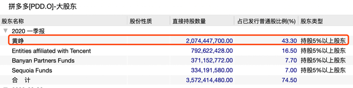 截至2020年一季度末,黄峥持有拼多多20.74亿股,占比43.3%,且持有88.4%的投票权。