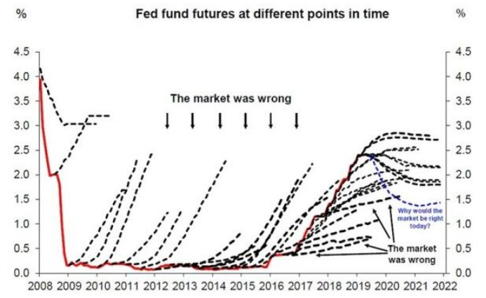 事实上,这一市场指标预测的准确性本身有待商榷。德意志银行分析师在去年6月曾警告称,市场惯用联邦基金期货估算美联储利率变动,但事实上两者落差往往巨大。如下图所示,图中的虚线是不同时间点的联邦基金期货预期,红线则显示美联储实际采取的行动。