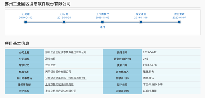 2019年4月,凌志软件的科创板IPO申请获上交所受理。历经多次问询后,最终在2019年11月6日成功过会。一直到2020年4月7日才注册成功。