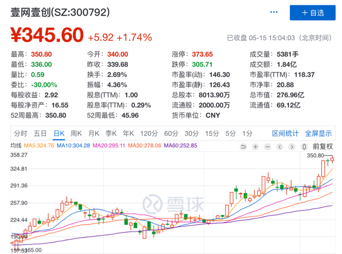 其中,壹网壹创(300792)最新收盘价为345.60元/股,这一价格较其38.30元/股的发行价暴涨了802.35%,最新总市值达276.96亿元。