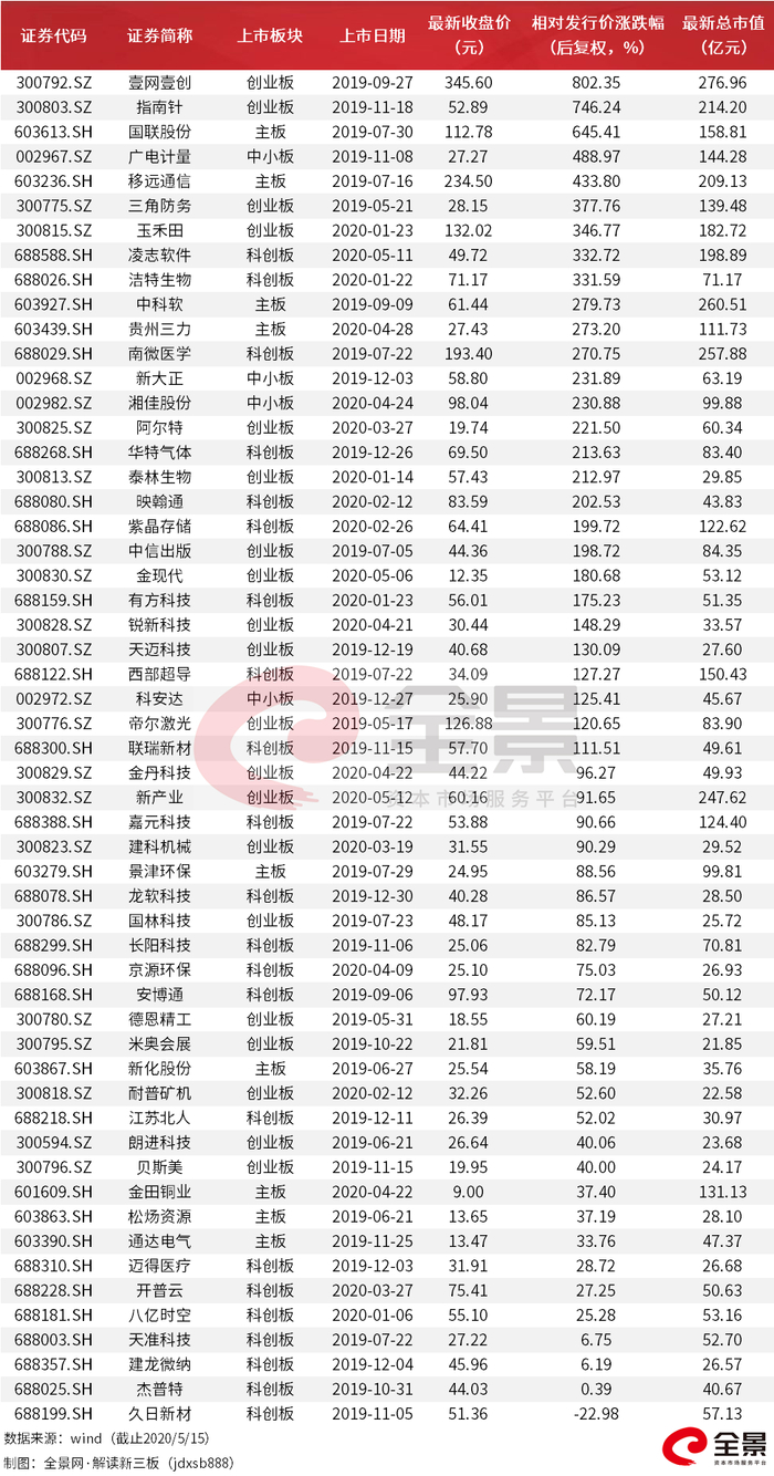 值得一提的是,这些转板个股中,也出现了多只100元以上股票。除了壹网壹创之外,截至5月15日盘后,移远通信、南微医学、玉禾田、帝尔激光、国联股份等个股股价均站上了100元之上。