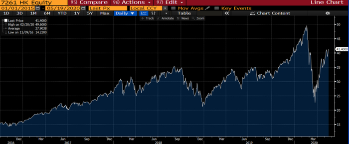 华夏基金(香港)于2016年推出7261,美股那时开始一直处于牛市状态,在正向2倍杠杆机制作用下,7261价格持续上行,由2016年最低价13.58升至2020年最高价49.90元,累计升幅267%。