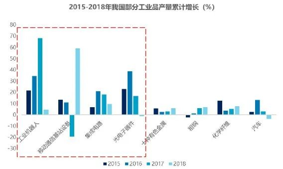 我国高端制造业增速远超传统制造业,产业结构不断优化。根据国家统计局的数据显示,2015-2018年,以工业机器人、移动通信基站设备、集成电路、光电子器件等为代表的高端制造业整体保持较高的增速;反观传统制造业,以十种有色金属、粗钢、化学纤维等为代表的传统制造业增速较低,与高端制造业增速差距较大。