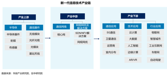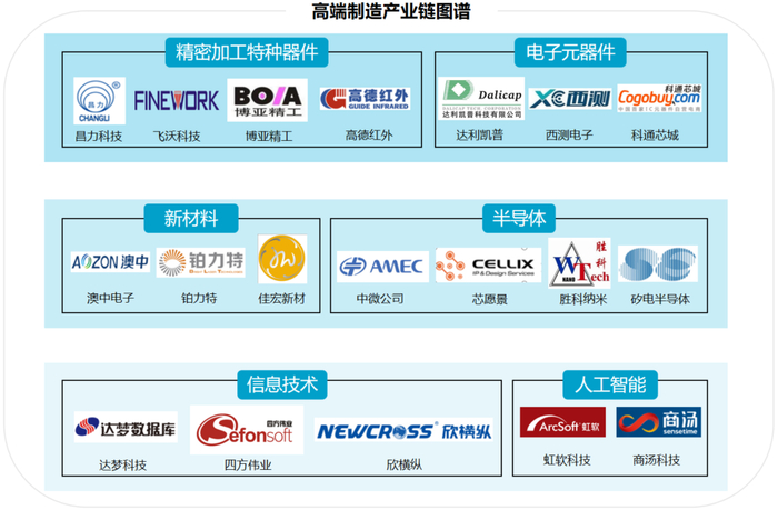 高端制造业可划分为精密加工特种器件、电子元器件、半导体、新材料、信息技术等几大关键赛道。产业链上可以分为技术支持层、基础设备层和产业应用层。技术支持层包括云计算、大数据及人工智能等支持技术;基础设备层包括关键设备、高端材料及关键器材等基础设备;产业应用层主要指新能源汽车、高端医疗器械、工业机器人等具体的垂直领域。本报告主要就高端制造的基础设备层及产业应用层展开研究。