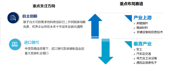 保证我国产业安全,实现自主可控是重中之重,产业链的进口替代将成为趋势。我国制造业与国外发展差距大,主要体现为在核心领域发展落后,关键技术受制于人,因此在国内需求旺盛、国产化率低的细分领域中进口替代的需求较为迫切。随着国际经济形势的变化,部分高端制造产品的进口受限,进一步倒逼我国加速进口替代。不同于前沿新兴技术的需求不确定和商业化落地速度慢,进口替代领域的需求确定,市场验证速度快,投资风险较小,是高端制造行业投资的重要方向之一。